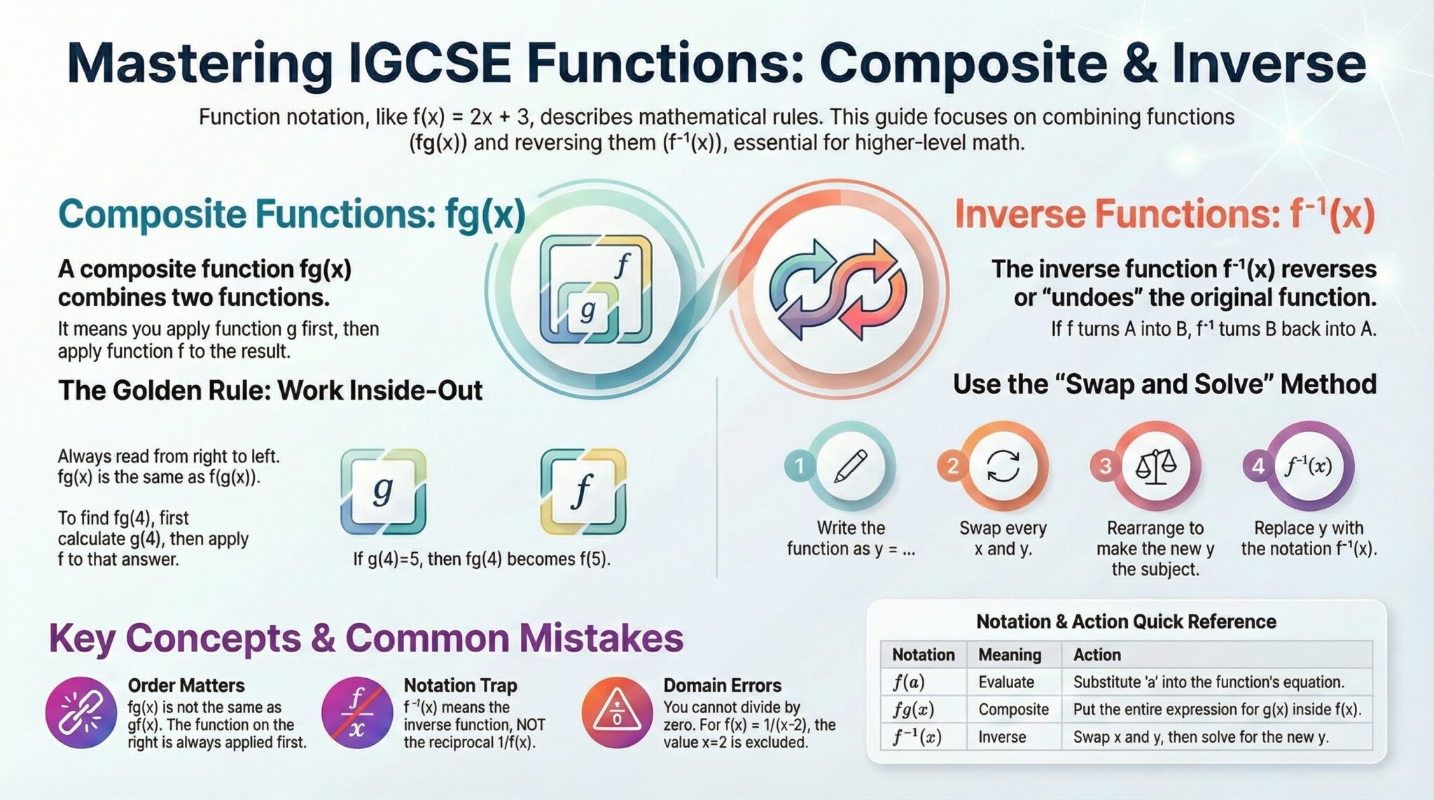“In the Edexcel IGCSE Higher Tier syllabus, Function Notation replaces ‘y=’ with ‘f(x)=’ to describe mathematical relationships. Mastery involves three advanced skills: 1) Evaluating Functions (substituting inputs); 2) Composite Functions (fg(x)), which involves applying one function inside another (working right-to-left); and 3) Inverse Functions (f^{-1}(x)), which reverse the operation. Students must also understand Domain (valid inputs) and Range (possible outputs) to access top grades.”