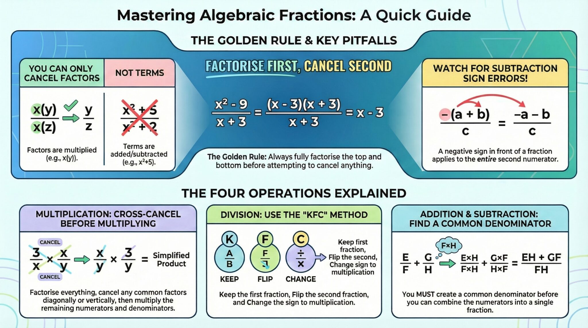 Algebraic fractions are simply fractions where the numerator, denominator, or both are algebraic expressions. They follow the exact same rules as numerical fractions, but with an added layer of complexity: you must be fluent in factorising.