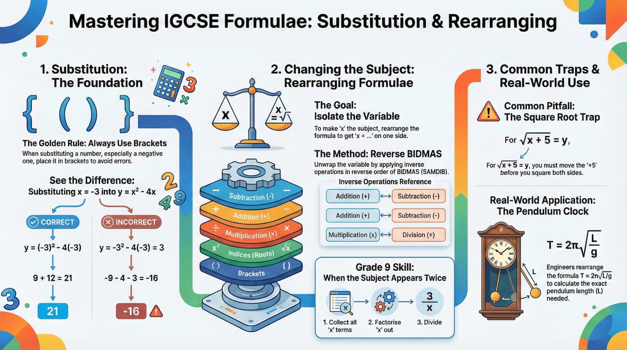 This guide covers Topic 2.3 of the IGCSE Algebra Hub, taking you from basic substitution to Grade 9 rearranging problems where the subject appears twice or is trapped inside a root.